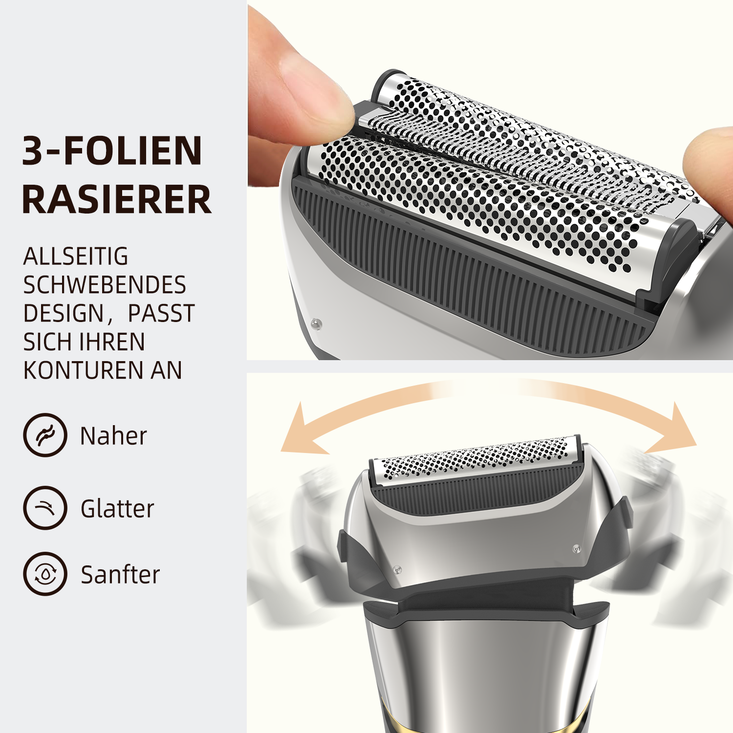 Triple-Head System: Et trelags bladsystem indfanger hår af varierende længder for en tættere og hurtigere barbering.